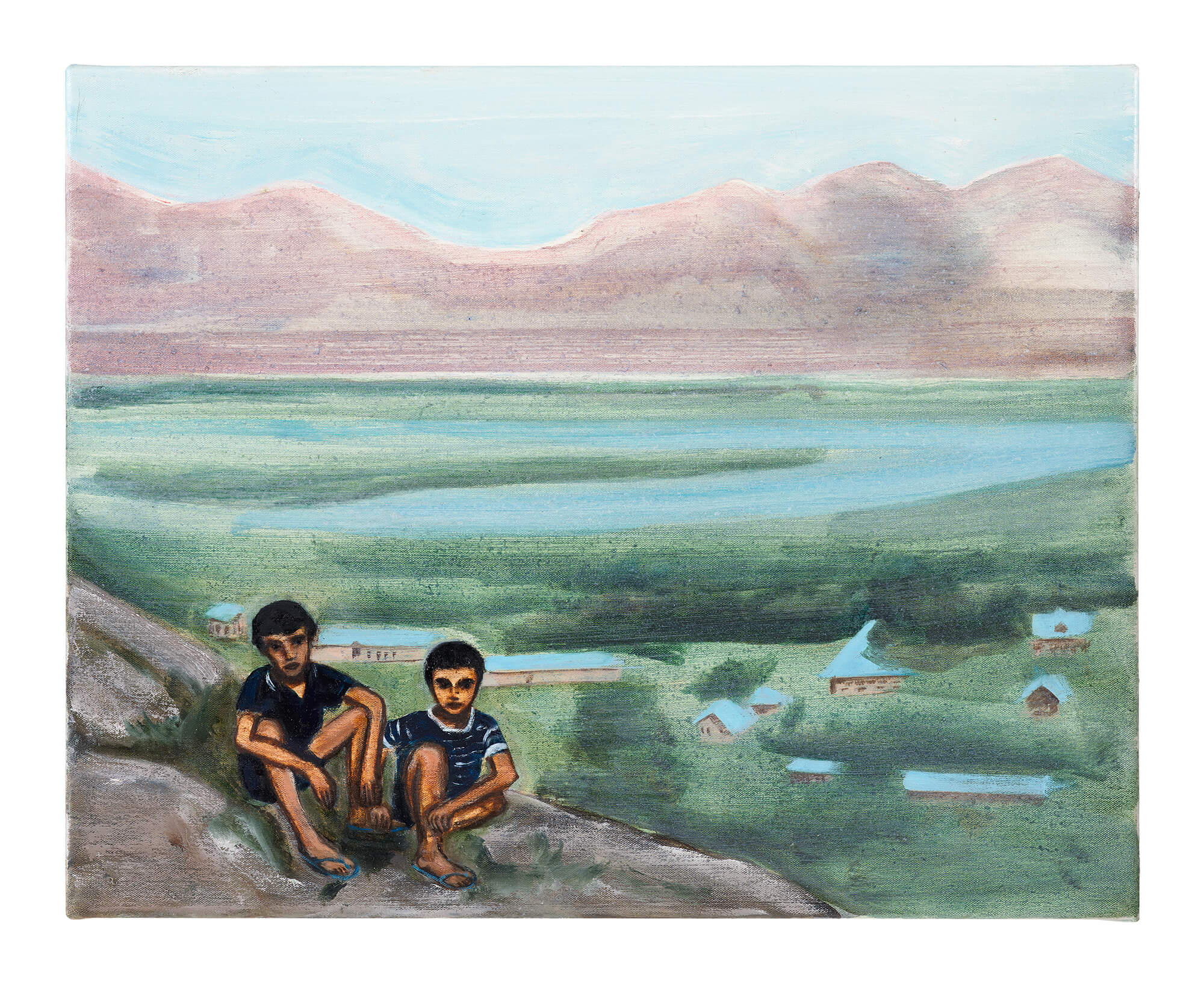Matthew Krishanu (b.1980, Bradford, UK) paints atmospheric, pared-back compositions including scenes from the artist’s life, particularly his childhood years in Bangladesh growing up with his brother, and their parents—a Christian priest, and a theologian. Some paintings reference religious scenes (clergy, church interiors, sacramental iconographies) while others center on recurring images of two boys, standing in for him and his brother, who often function as a single unit—or one boy, alone in the landscape.