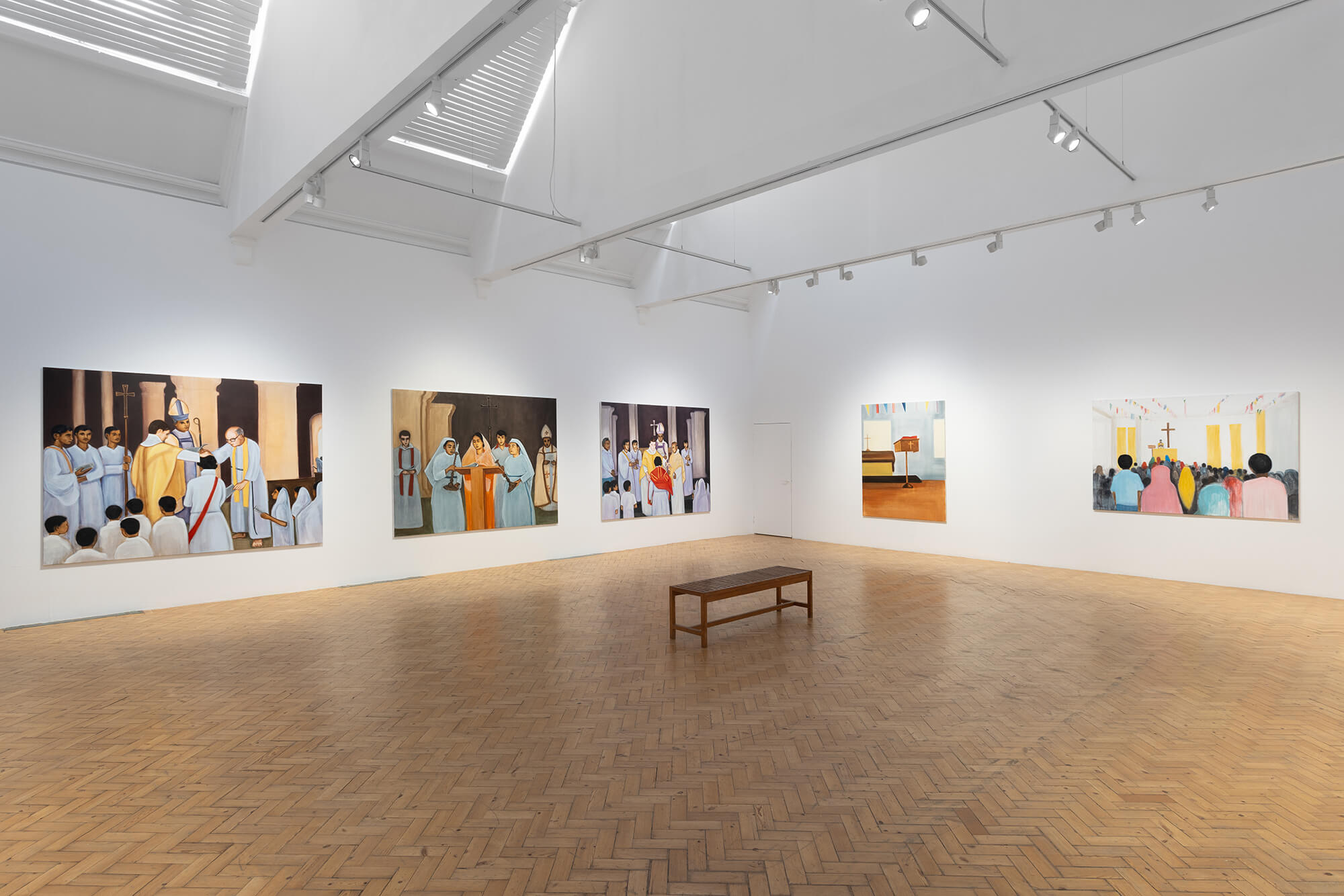 Krishanu presents works including White Sari (Christ) (2024), Domed Church (Kochi) (2025), Cave and Madonna (2024), and Bishops and Altar (2021), paintings that hold within them the tension between everyday life, forms of reverence, and the need for reimagination. Krishanu divines a history foraged from memories and imagination that spans themes of family, childhood, play, and religion, among others, through a considered, restrained language of painting. These solidly painted figures in Krishanu’s paintings serve as “entry-points”. They are surrogates for us to imagine how we may occupy these times and histories. Through large, translucent strokes of thinned oil paint and acrylic, he pares back landscapes and settings, choosing affinity and suggestion over exactitude.