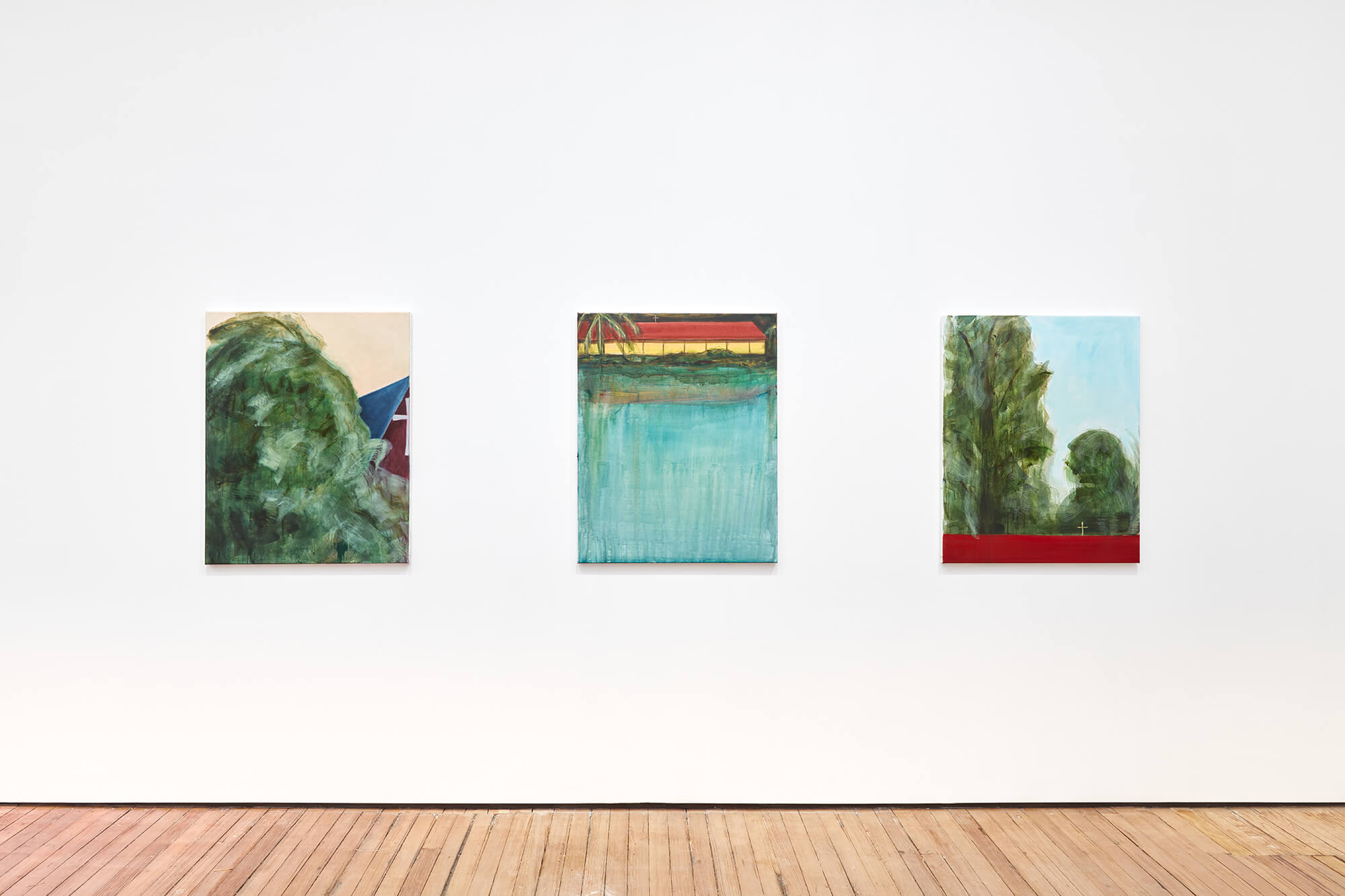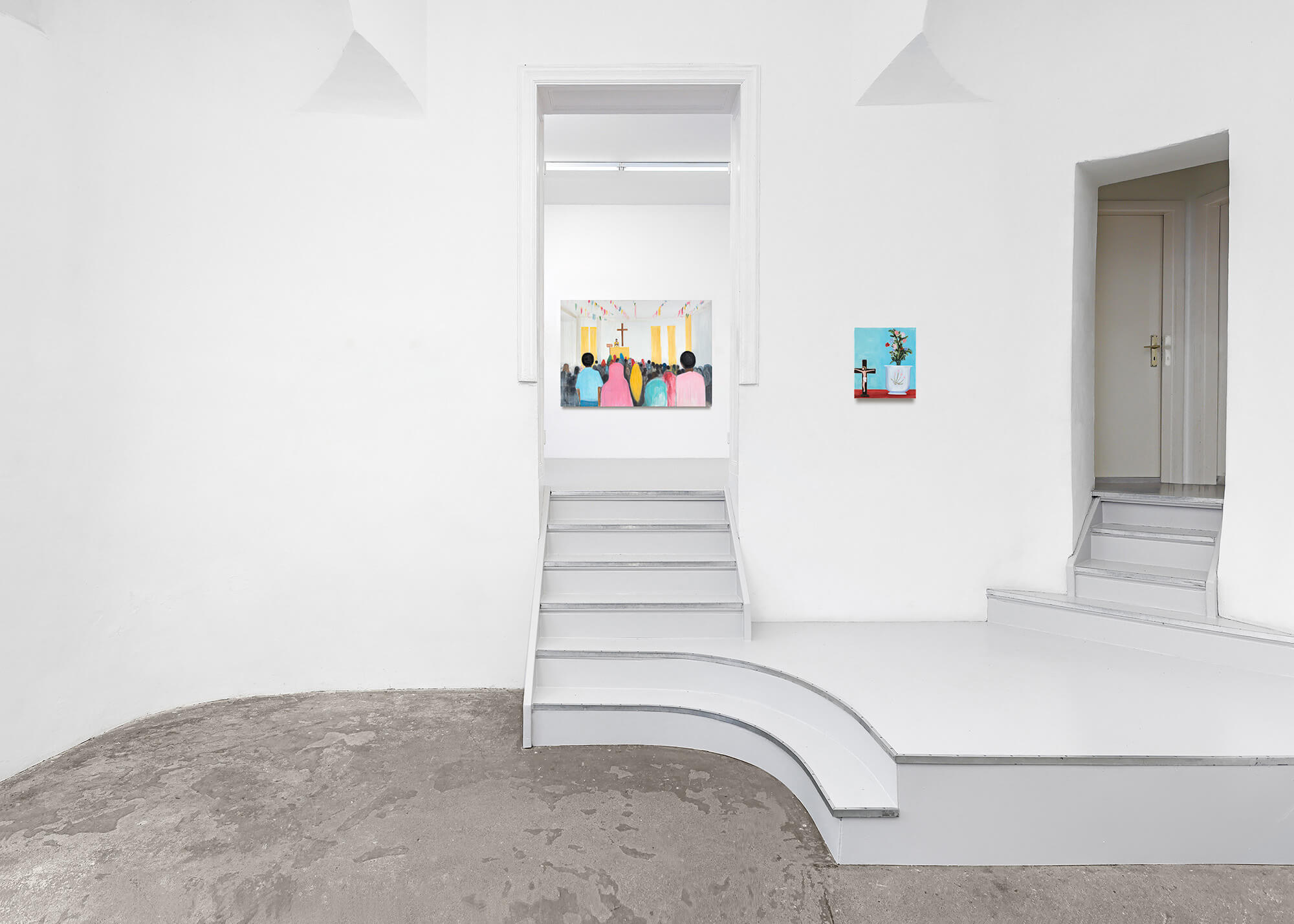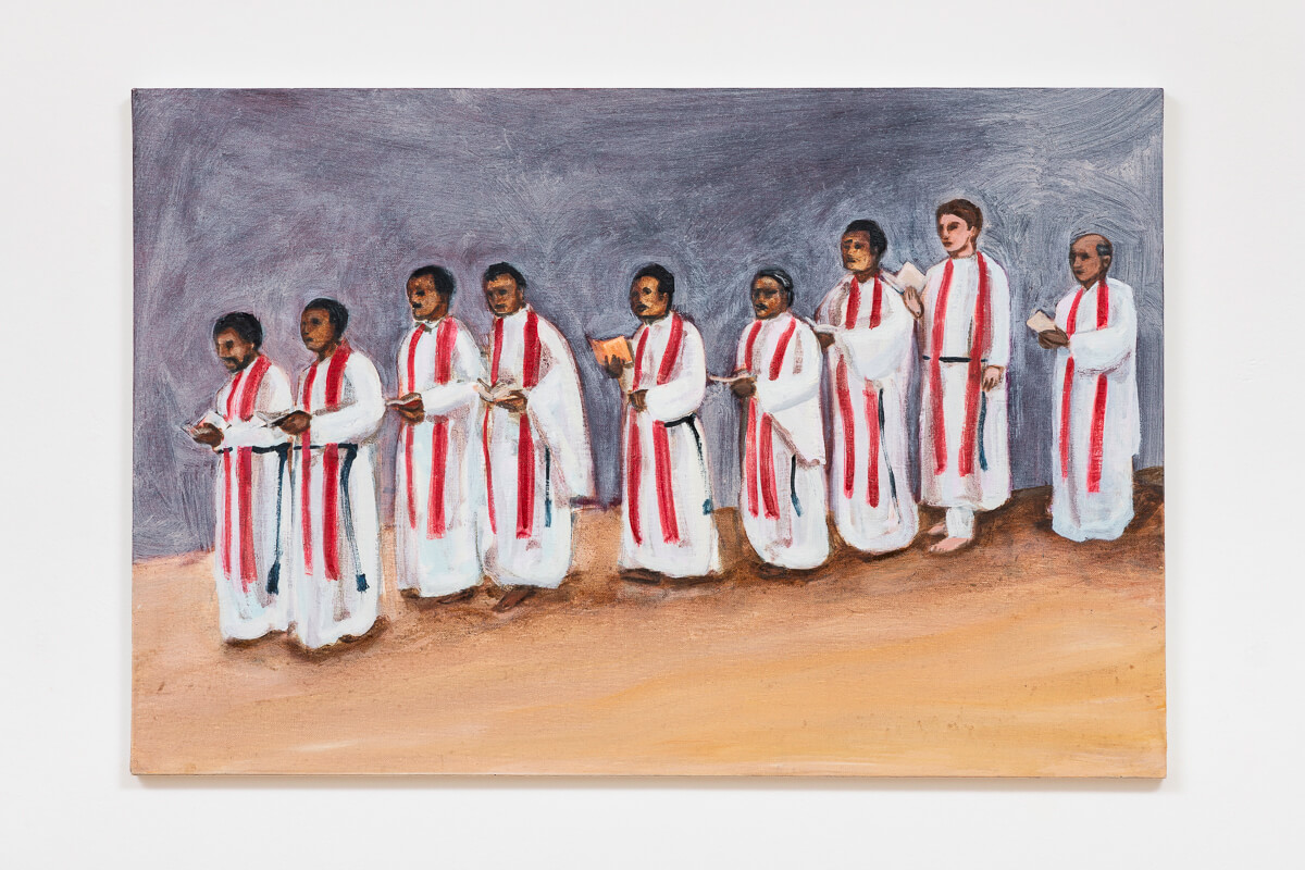 Matthew’s paintings of religious meetings, ceremonies and churches are painted in a simple and abbreviated style with thin washes of paint and bold, assertive marks. Yet his uncomplicated aesthetic belies a complex web of historical and cultural undercurrents that serve to problematise his beguiling images.