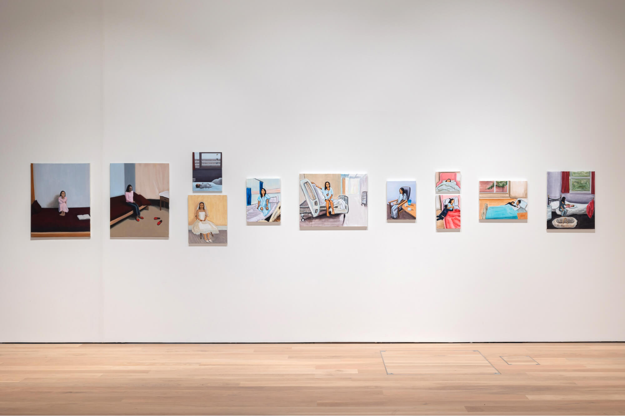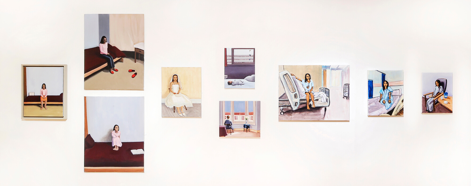Matthew Krishanu’s series In Sickness and In Health features paintings made across a fifteen-year period. These include portraits of his wife who is currently very unwell and regularly in hospital, alongside their daughter, painted as a small baby (in 2010), who features in the centre of the series.