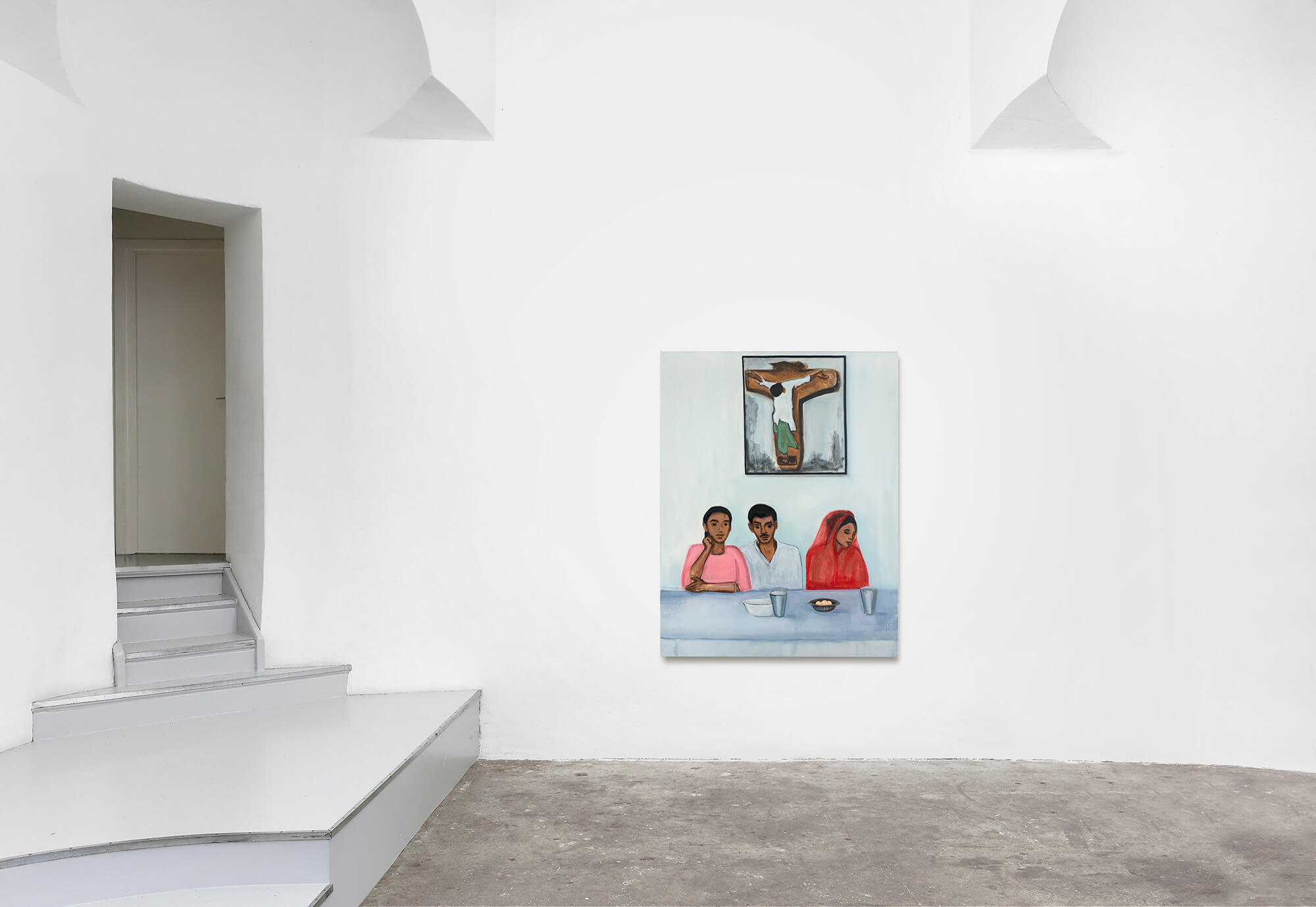 In ‘Mission School’ (2017), twelve children are seen looking at a copy of Leonardo da Vinci’s ‘The Last Supper’ which is propped on an easel. The children occupy the very bottom of the picture plane. Flatness and a lack of pictorial depth give way only in one part – the reproduction of ‘The Last Supper’. Christ is at the centre of the work, the viewer’s gaze directed by the diagonal of his left arm. This is a sudden appearance of the conventional perspective associated with Renaissance and pre-modern canonical art history, puncturing the rest of the picture plane.