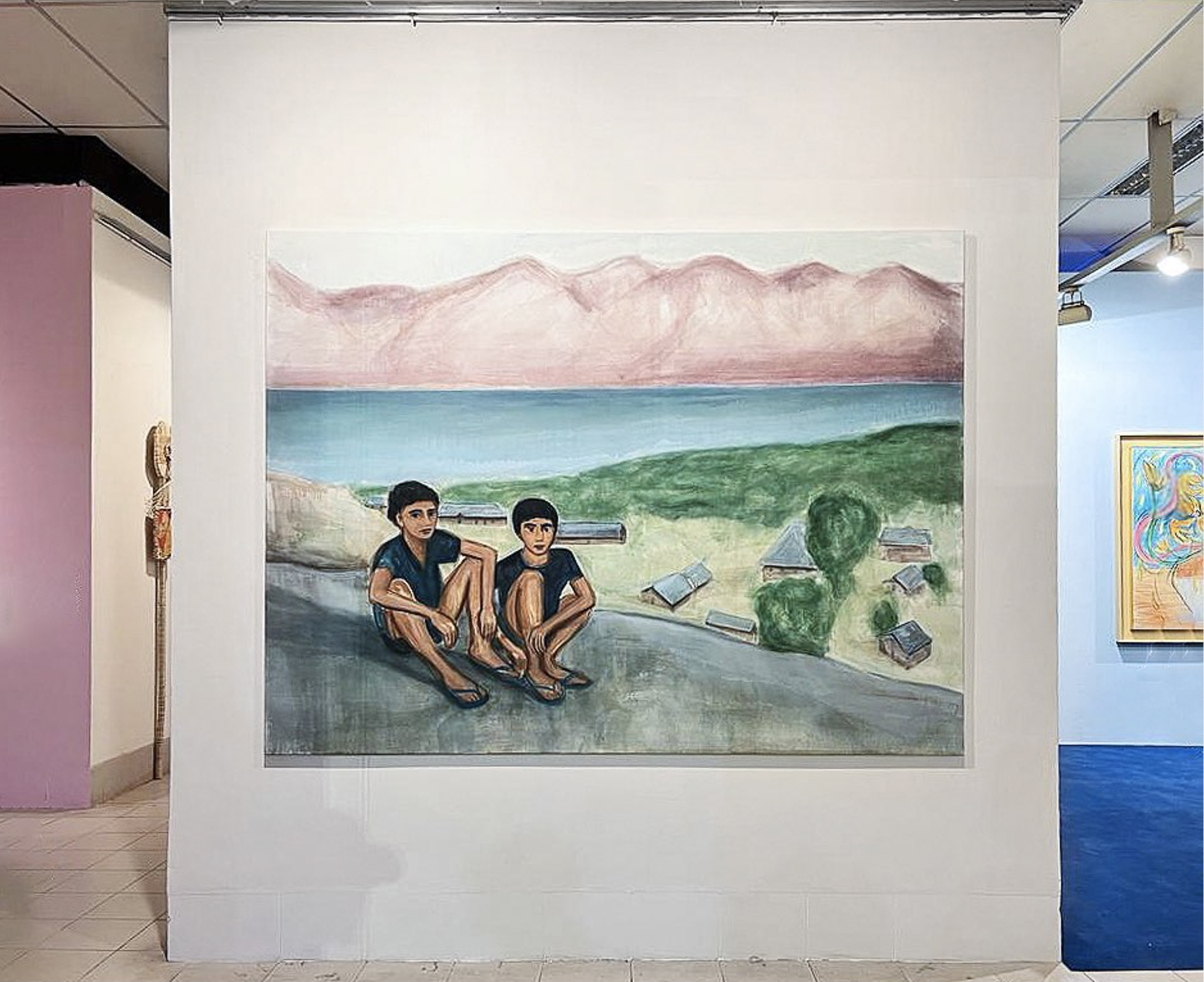 Memories of childhood permeate the subtropical world that Matthew Krishanu constructs in his evocative paintings. In these works, the past is distilled and reassembled to create vivid scenes that feel fused to a former time. Tangible environments shape these narratives: powdery pastel terrains are bookended by cloudless blue skies and pools of turquoise water, while interior spaces (particularly churches) incorporate palm trees and other vernacular additions, such as primary-colour streamers that cascade from the ceiling.
